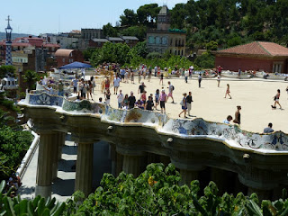 We continue on our tour to Parc Guell. You can imagine gremlins living in this unique fairy tale park located high up in the city. It is evidence of more of Gaudi’s work who was a creative genius way ahead of the times. Two Hansel and Gretel type houses are at the entrance, a mosaic serpent and a wonderful multi coloured ceramic bench curves around the esplanade. Scenic views from here over the city are spectacular. Gaudi is said to have loved religion and nature and so many of his structures involve a crosses and you can see these on the tops of houses, buildings, churches...just everywhere. Mosaics made of ceramics are the trademark.